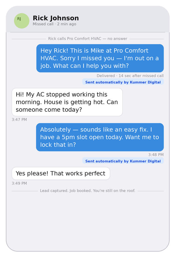 Within seconds of a missed call, your customer gets a text. They reply. The job gets booked. You find out when you get off the roof.